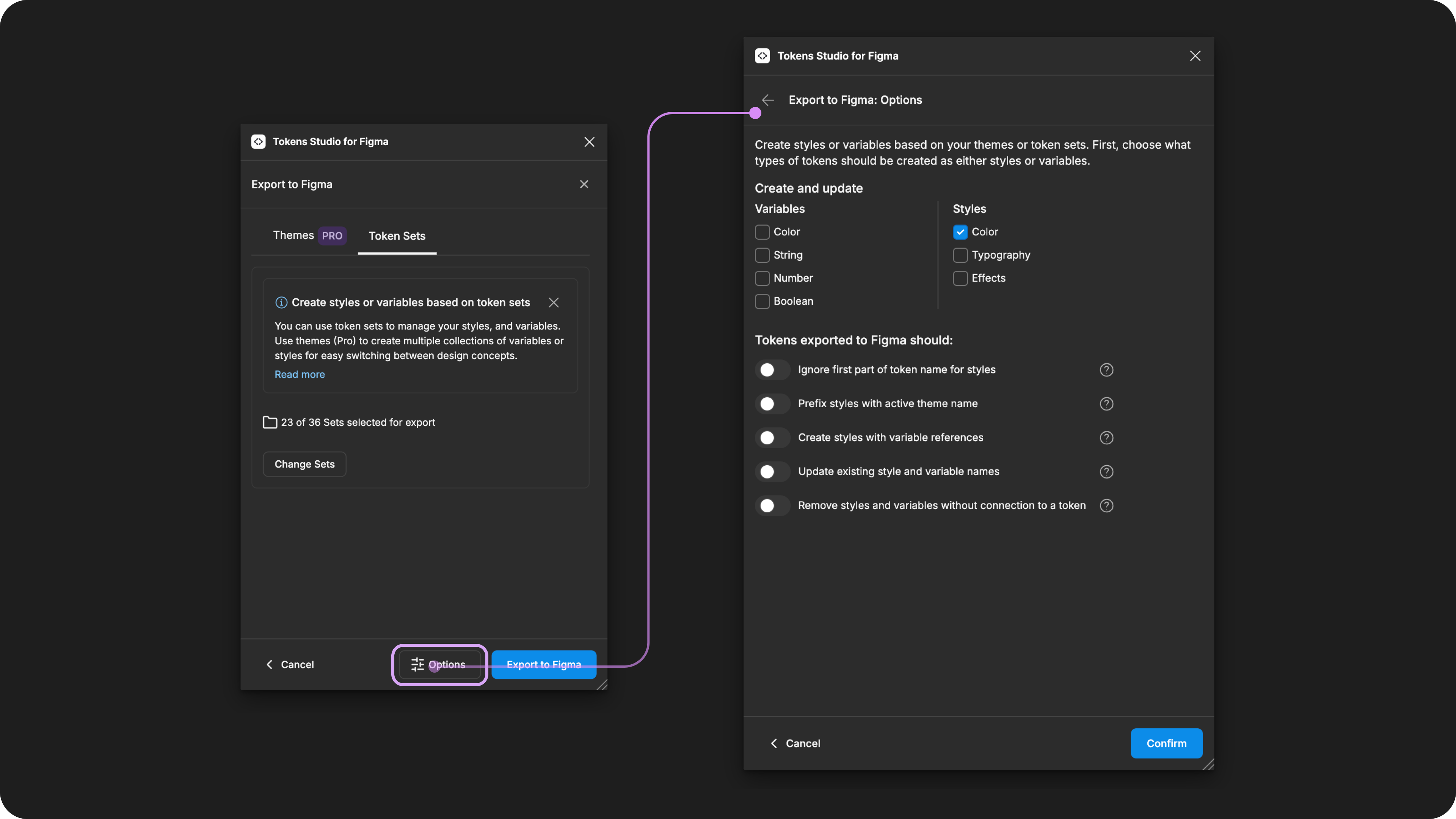 The Export to Figma Options menu has important settings for creating or updating Styles and Variables connected to your Tokens.